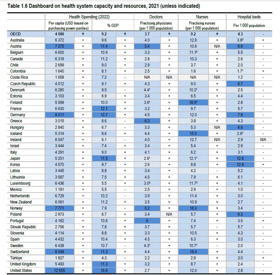Il grafico sopra serve a dare un’idea della quantità di risorse che i paesi elencati dedicano alla sanità. Nel 2022, gli Usa primeggiano, con oltre 12 mila dollari pro capite, che corrispondono al una spesa complessiva pari al 16,6% del pil, di fronte ai quali i nostri poco più che 4 mila dollari pro capite, il 9% del pil, impallidiscono, pure se sono vicino alla media di quasi 5 mila dollari e al 9,2% del pil dell’area.