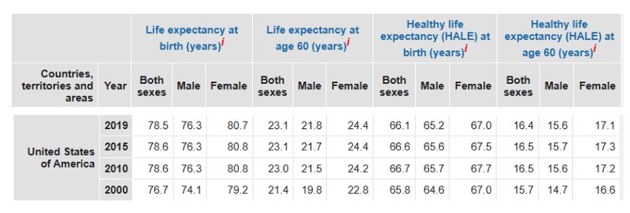 Infine, sorge il sospetto che la longevità vada più veloce della vecchiaia in salute. Se cambiamo database e ci rivolgiamo a quello dell’organizzazione mondiale della sanità, possiamo ritrovare i dati relativi agli Stati Uniti, anche sulla qualità dell’invecchiamento in questo paese a partire dal 2000.