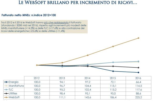 Sono bastati un pugno di anni alle compagnie che vivono del web per raddoppiare i ricavi. Più che raddoppiarli. Gli altri settori, quelli che amministrano le noie della nostra vita quotidiana, vivacchiano. Ma i padroni del websoft, che amministrano le gioie dell’effimero, prosperano.