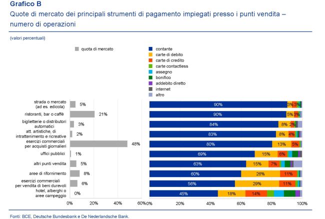Altra osservazione che vale la pena sottolineare: “Nell’area dell’euro, il contante è stato lo strumento di pagamento più diffuso per le operazioni fino a 45 euro. Le carte sono risultate il mezzo di pagamento utilizzato più spesso per importi superiori a 45 euro. Tuttavia, soltanto il 9 per cento di tutti i pagamenti registrati aveva un valore superiore ai 45 euro”. Inoltre, “il fatto che la maggior parte delle operazioni sia avvenuta in luoghi dove i pagamenti in contanti rappresentano tra l’80 e il 90 per cento del totale dei pagamenti, oltre al fatto che due terzi di tutte le operazioni hanno riguardato importi inferiori ai 15 euro, può in parte spiegare come mai il contante è più usato di quanto spesso si creda”. Ma soprattutto emerge che “il 6 per cento degli affitti, il 13 per cento delle utenze elettriche e il 31 per cento delle fatture mediche vengono pagate in contanti”.