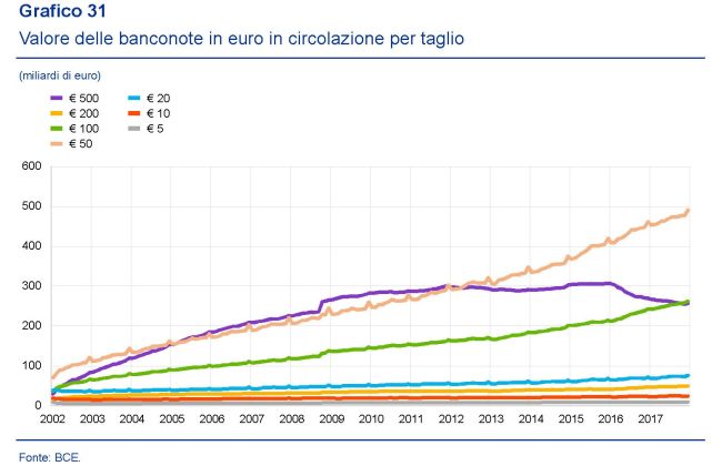 “Si stima – riporta il rapporto – che, in termini di valore, circa un terzo delle banconote in euro in circolazione sia detenuto al di fuori dell’area dell’euro. Si tratta soprattutto dei tagli maggiori, che sono detenuti principalmente nei paesi confinanti e sono utilizzati come riserva di valore e per il regolamento delle transazioni sui mercati internazionali”. Notate che le banconote da 500 euro, che la Bce ha smesso di produrre da maggio 2016, anche per il timore che favorissero transazioni illecite, sono state superate in valore solo di recente da quelle da 50 e sono state raggiunte da quelle da 100. Insomma: i grossi tagli che si vedono molto poco sono ancora molto utilizzati nei circuiti di pagamento.