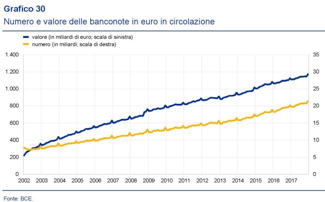 L’inestinguibile passione per il denaro cash, che abbiamo già osservato a livello globale, non poteva certo risparmiare l’euro che ormai è una valuta molto richiesta anche fuori dall’eurozona. Nel suo ultimo rapporto annuale la Bce fa un po’ di conti e osserva l’andamento crescente del numero e del valore delle banconote in euro in circolazione, che, come si può osservare non conosce crisi.