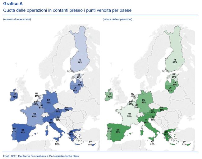 L’Italia, con Spagna e Slovenia, si colloca quarta per valore delle operazioni regolate in contanti, con una quota pari al 68%, dopo Malta, Grecia e Cipro. Nell’aggregato EZ la media è del 54%, a fronte di un 39% con carta di credito e un altro 7% con altri strumenti di pagamento.
