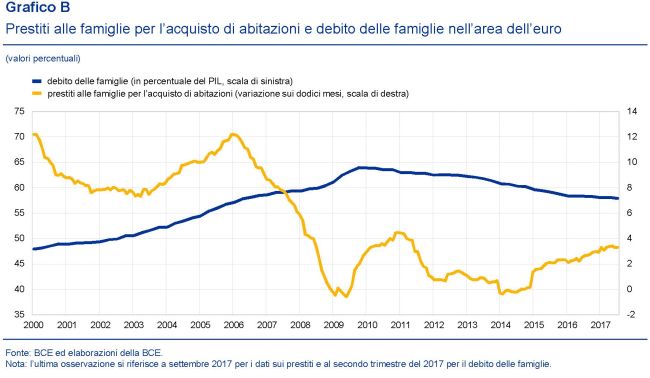 Tale accelerazione, tuttavia, non sembra preoccupare la Bce, che nota come “pur registrando un’accelerazione tendenziale fino a oltre il 4 per cento nel terzo trimestre del 2017, la crescita nominale dei prezzi degli immobili residenziali è rimasta al di sotto della sua media storica e ben al di sotto dei valori precedenti la crisi”. A guidare l’andamento dei prezzi è stata ovviamente la forte domanda “sostenuta in misura crescente dall’aumento del reddito delle famiglie” supportata anche dall’aumento dei prestiti per l’acquisto delle abitazioni che ha superato il 3% su base annua a fine 2017. A ciò si è aggiunto il calo dell’indebitamento delle famiglie, arrivato al 58% del pil nel terzo trimestre 2017.