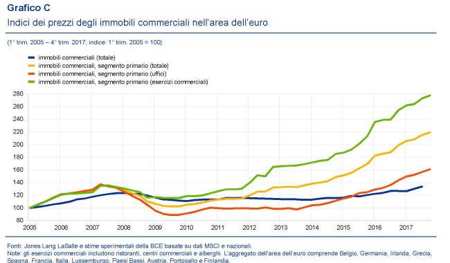 Sul versante degli immobili commerciali, il surriscaldamento dei prezzi è stato ancora più pronunciato. “Nel 2016, il tasso di crescita sui dodici mesi dei prezzi degli immobili commerciali nell’area è salito al 5,1 per cento, dal 3,8 del 2015 e dall’1,9 per cento del 2014. Tale aumento dei prezzi è stato trainato dal segmento primario del mercato immobiliare commerciale (in cui i prezzi hanno registrato una crescita tendenziale del 18 per cento nel 2016, rispetto al 14 per cento dell’anno precedente) e, in particolare, dal segmento primario degli esercizi commerciali, in cui i prezzi hanno continuato a salire anche nel 2017.