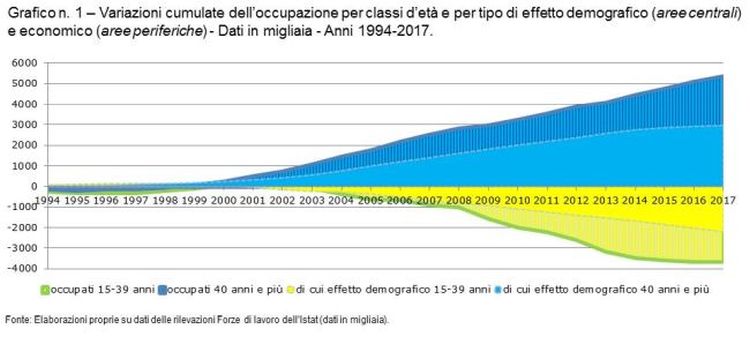 Al contrario, la crescita dell’occupazione anziana oltre i 40 anni, dal 2000 al 2017, può essere ascritta alla dinamica demografica per +2,7 milioni e alla componente economica per +2,4 milioni di persone.