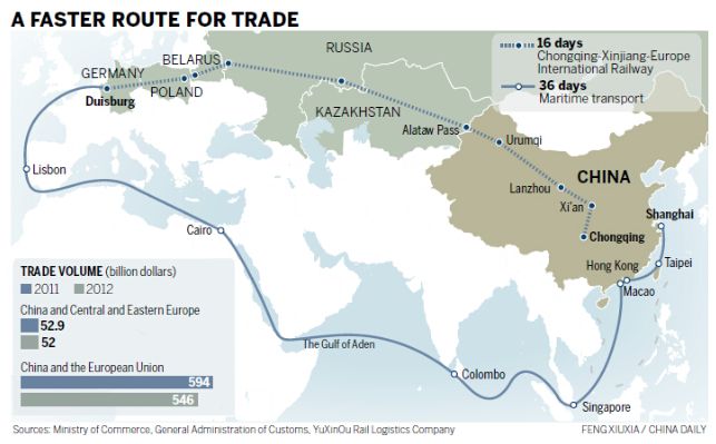 Il cambiamento si verificò a partire dal 2011, quando la Cina varò la politica cosiddetta di Go West, con la quale fornì incentivi a chi produceva nei territori interni della Cina. Un anno prima era stato realizzato un collegamento fra Shenzhen e Chongqing, città dove si concentrano parecchie fabbriche cinesi, che ha consentito di far arrivare componenti importate dal Sud Est asiatico che servivano per completare l’assemblaggio che Foxconn, Hewlett-Packard e altri realizzavano per completare la produzione di computer Apple e stampanti. Si pensò all’inizio di esportare tali componenti attraverso il fiume Yangtze, ma il traffico era alquanto congestionato. Sicché HP ha spinto le compagnie ferroviarie di Germania, Polonia, Russia, Bielorussia, Kazakistan e Cina a cooperare per trovare una soluzione capace di collegare direttamente la città cinese di partenza con quella tedesca di destinazione.