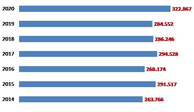 Numero di decessi in Italia nel periodo gennaio-maggio di ciascun anno 2014-2020