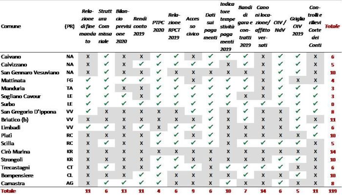 Il comune di Cirò Marina (KR) colleziona 14 inadempimenti (100%), con la pagina 'Amministrazione Trasparente' praticamente priva di contenuti; non va molto meglio a Briatico (VV) dove mancano o non sono aggiornate 11 sezioni (79%), e a San Gennaro Vesuviano (NA), Platì (RC), Strongoli (KR) e Bompensiere (CL), ciascuno con 10 carenze (71%). Un ottimo lavoro è stato invece svolto dalla gestione commissariale a Surbo (LE), dove tutte le pagine consultate risultano aggiornate.