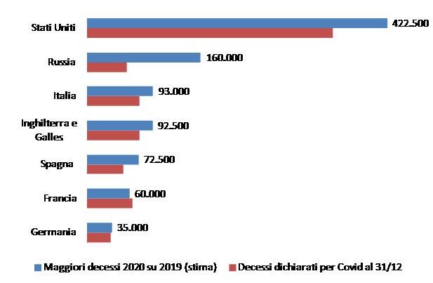 Rapportando il maggior numero di decessi alla popolazione residente, in Italia e Spagna sono 1,5 in più ogni mille abitanti; in Inghilterra e Galles 1,4; negli Stati Uniti 1,3; in Russia 1,1; in Francia 0,9 e in Germania 0,4.