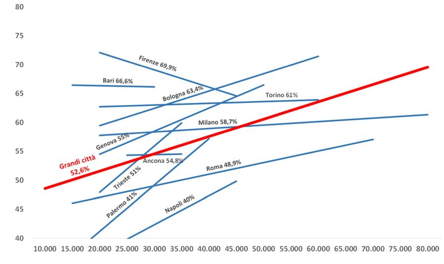 L’analisi del voto alle europee del 2019 e confermata alle più recenti politiche del 2022, mostra che in tutte le grandi città l’affluenza è maggiore al crescere del reddito (retta inclinata verso l’alto), con una tendenza ancora più accentuata per le città a minor reddito.