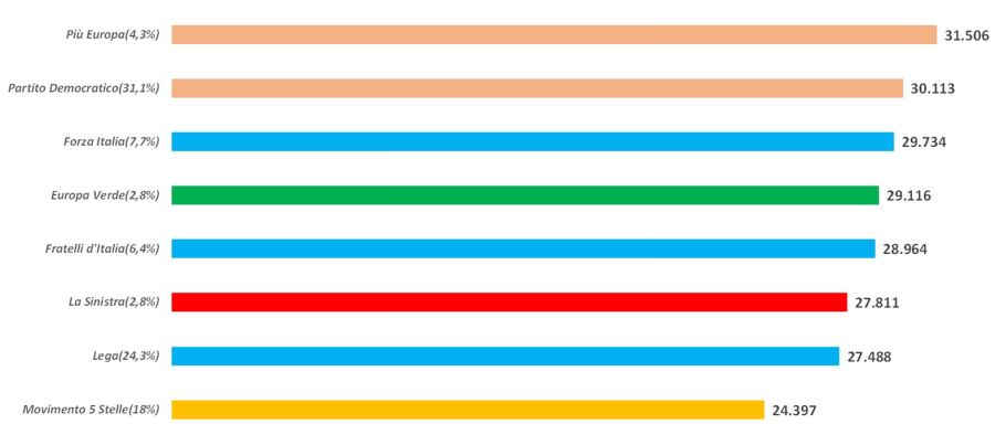 Alle europee del 2019, la maggiore partecipazione al voto fu registrata a Firenze e Bari, dove si votava contemporaneamente anche per il rinnovo del Sindaco (come avverrà anche quest’anno), peraltro le uniche due in cui il rapporto tra voti e redditi – in particolare nel capoluogo toscano - è invertito. A Napoli e Palermo non si andò oltre il 40% e le grandi città fecero registrare una percentuale di circa due punti inferiori alla media nazionale, anche per la maggiore presenza di residenti all’estero iscritti nelle liste anagrafiche.