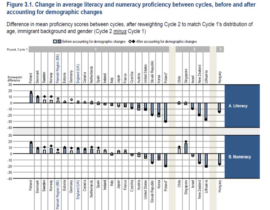 Tolti Finlandia e Danimarca, dove le competenze alfabetiche degli adulti nell’ultimo decennio sono migliorate, negli altri paesi dell’area queste sono rimaste stagnanti o sono declinate. Quanto a quelle numeriche, otto paesi le hanno viste in miglioramento, con sempre la Finlandia e Singapore ad ottenere i piazzamenti migliori.