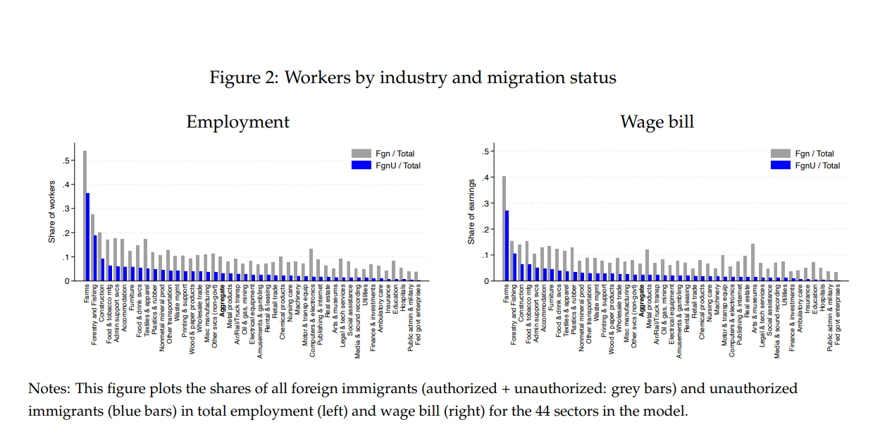 Nel 2024, spiegano gli autori, gli immigrati non autorizzati rappresentavano il 3,2% dei lavoratori USA, pari a diversi milioni di persone. Gli immigrati autorizzati – titolari di green card, visti o protezioni temporanee come DACA o TPS – sono il 6,8%. In totale, circa il 10% della forza lavoro è composta da non cittadini non naturalizzati.