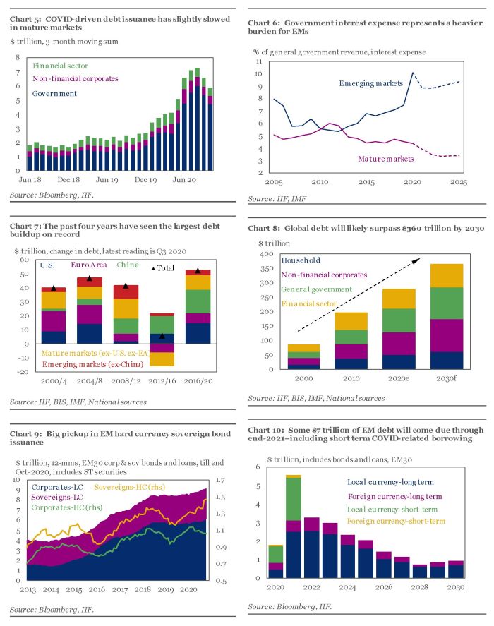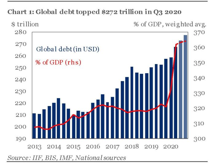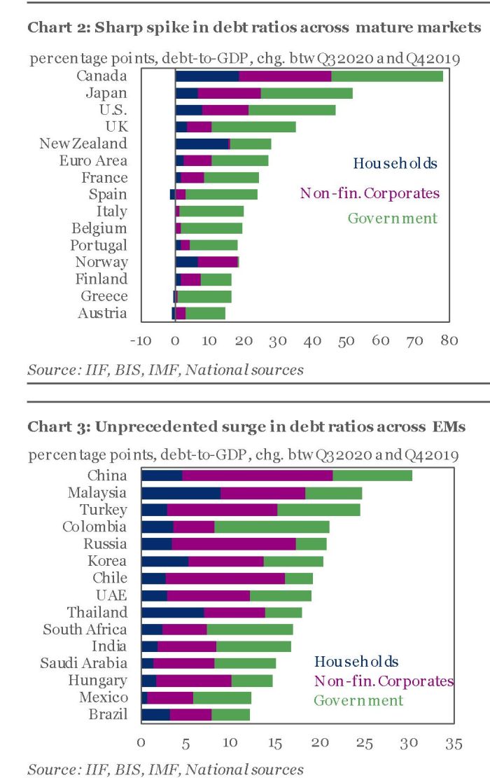 Ma a fare scuola non sono certo i paesi emergenti, dove la Cina primeggia indisturbata, ma le economie avanzate, che hanno iniziato da molto più tempo la loro cavalcata. L’IIF ha calcolato che i debiti globali nei mercati maturi siano arrivati al 432% del pil nel terzo trimestre del 2020, con un incremento di 50 punti rispetto a un anno fa. Il grosso di questo aumento è avvenuto negli Usa, che hanno contribuito per la metà.