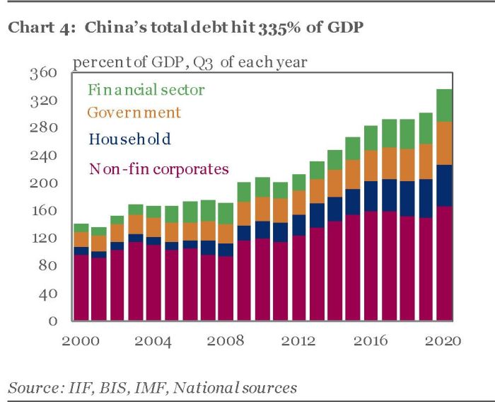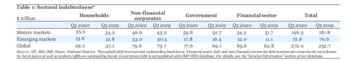 Quanto ai settori, il debito fuori dal sistema finanziario è arrivato a 206 trilioni nel terzo quarto di quest’anno, dai 194 del 2019. I governi hanno pesato il 60% di questo incremento. Il debito del settore corporate è cresciuto di 4,3 trilioni nello stesso periodo e quello delle famiglie di “appena” 500 miliardi, arrivando a quasi 50 trilioni.