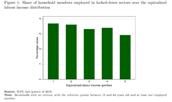 Sulla base di queste premesse, il lavoro ha dedotto che il lockdown, come era facile immaginare, ha colpito più duramente le famiglie più povere, per le quali è più elevata la possibilità di essere impiegate nei settori non essenziali e che hanno meno possibilità di lavorare da casa. Non a caso, la quota di famiglie impiegate nei settori colpiti dal lockdown è più elevata nel primo quintile di reddito, quindi quello più basso.