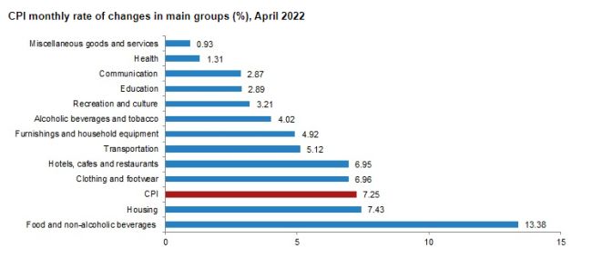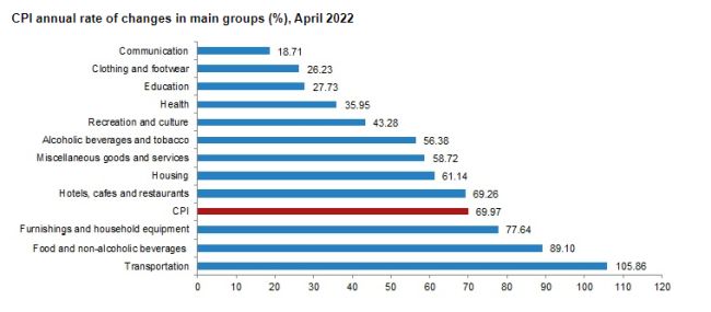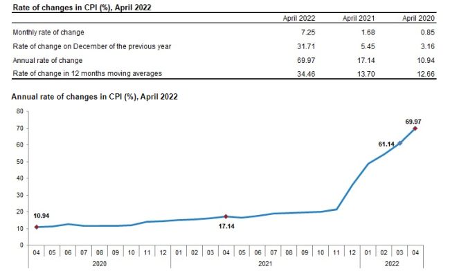 L’inflazione, infatti, è aumentata del 7,25% ad aprile rispetto a marzo e quasi del 70% rispetto ad aprile 2021. Si conferma, insomma, l’accelerazione crescente osservata negli ultimi mesi, che ovviamente è stata aggravata dal contesto internazionale.
