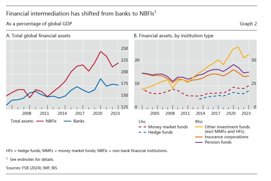 Una di queste conseguenze, che la Bis molto opportunamente mette in evidenza, è stata l’importanza crescente che i Non Bank financial institutions (NBFIs) hanno assunto nel panorama finanziario internazionale. Queste entità, che comprendono investitori di lungo termine come i fondi pensione e le assicurazioni, ma anche fondi sovrani ed Hedge fund, sono i veri figli della crisi del 2008. Non nel senso che non ci fossero anche prima – c’erano eccome – ma che la loro importanza è cresciuta enormemente. Fra il 2009 e il 2023, infatti, gli asset totali di questa categoria di investitori sono aumentati dal 167% al 224% del pil globale, che si confronta con una crescita degli asset bancari passata dal 164 al 177% del pil.