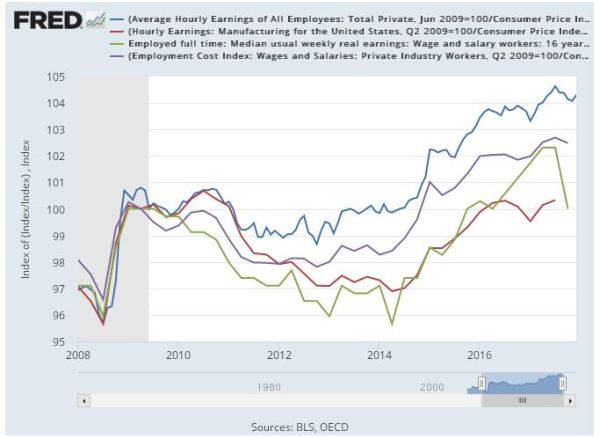 Giusto due righe per guardare ai dati che mostrano come, nel migliore dei casi, prendendo a esempio il dato sui guadagni orari, l’aumento reale dei salari al novembre 2017 sia stato di circa il 4% rispetto al livello di giugno 2009. Scusate se è poco.