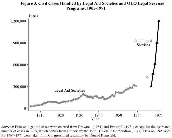Fra il 1965 e il 1971 la disponibilità di consulenza legale su diverse tematiche per i poveri triplicò. Gli avvocati, che un qualche giudice definì “fabbriche di divorzi”, istruirono centinaia di migliaia di cause l’anno, arrivano a superare il milione. Di queste circa un quinto erano divorzi. D’altronde erano gli anni (1966) che il New York Times titolava “How to get a free divorce“. Ma queste consulenze servivano anche a rendere maggiormente consapevoli dei propri diritti i meno abbienti, e anche a difenderli dai soprusi della burocrazia, quando necessario.