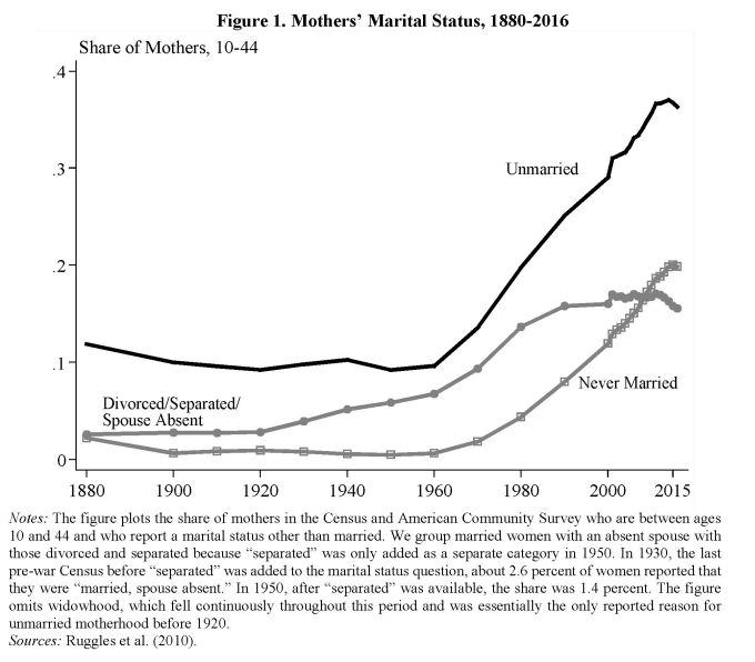 L’analisi condotta dagli economisti del Nber mostra che questi servizi ebbero impatti rilevanti sulla famiglia americana. I tassi di divorzio aumentarono, ma anche gli aiuti alle famiglie con figli o i programmi di assistenza per le famiglie monoparentali. Tutto ciò contribuì a cambiare la struttura delle famiglie. Già nel 1984, il tasso di nascite fuori dal matrimonio era cresciuto del 16% rispetto a un ventennio prima, mentre era scesa del 2% la probabilità che una madre vivesse col marito dei suoi figli. Questo non dipese dall’aumento delle nascite, ma dal declino dei matrimoni.