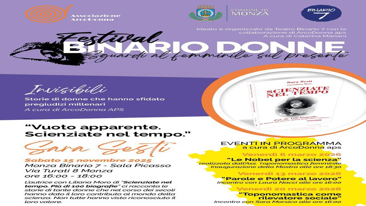 Sara Sesti, autrice con Liliana Moro del libro "Scienziate nel tempo. Più di 100 biografie", il 15 novembre prossimo, dalle ore 16:00 alle ore 18:00, al Teatro Binario 7 di Monza (Sala Picasso), dialoga con il pubblico per raccontare, con “Vuoto apparente. Scienziate nel tempo”, la storia di tante donne straordinarie che hanno operato nel campo delle scienze, a lungo riservato solo agli uomini.