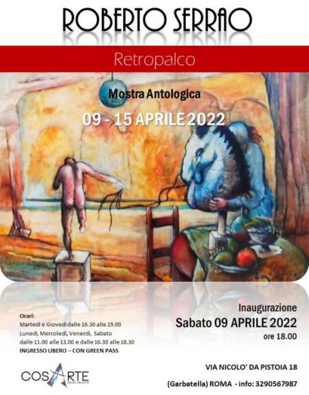 Il prossimo 9 aprile, alle ore 18, presso la Galleria d’arte Cosarte, in via Nicolò da Pistoia 18, a Roma, vernissage della Mostra antologica “Retropalco” del Maestro Roberto Serrao (ingresso libero, con Green pass).