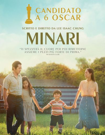 Minari, regia di Lee Isaac Chung, con Alan Kim - David, Yeri Han – Monica, Noel Kate Cho - Anne, Steven Yeun - Jacob, Darryl Cox - Sig. Harlan, Esther Moon - Sig.ra Oh, Ben Hall - Dowsing Dan, Eric Starkey - Randy Boomer, Will Patton - Paul, Youn Yuh-jung - Nonna Soonja, Jacob Wade - Johnnie, Jim Carroll - Frate Roy, Jenny Phagan - Bonnie, Tina Parker - Debbie, Chloe Lee - June, Scott Haze - Billy; Sceneggiatura: Lee Isaac Chung; Fotografia: Lachlan Milne; Musiche: Emile Mosseri; Montaggio: Harry Yoon; Scenografia: Yong Ok Lee; Costumi: Susanna Song; USA 2020; Genere: Commedia; Durata: 115'; Produzione: Dede Gardner, Jeremy Kleiner, Christina Oh, Plan B Entratainment; Candidato a 6 Oscar; in programmazione nelle sale dal 26 aprile 2021.
