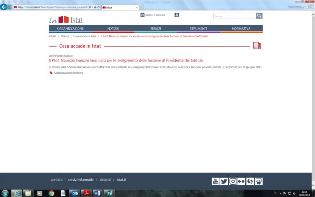 Per puro caso, però, abbiamo appreso che due giorni fa, vale a dire il 18 settembre, l’ente di via Balbo, senza squilli di trombe, anzi quasi alla chetichella, aveva comunicato - con uno striminzito quanto laconico annuncio dal titolo Il Prof. Maurizio Franzini incaricato per lo svolgimento delle funzioni di presidente dell’Istituto, apparso sulla pagina “Intranet” (il cui accesso è consentito al solo personale dello stesso ente) - che: “In attesa della nomina del nuovo vertice dell’Istat, sono affidate al Consigliere dell’Istituto prof. Maurizio Franzini le funzioni previste dall’art. 3 del DPCM del 28 giugno 2011”.