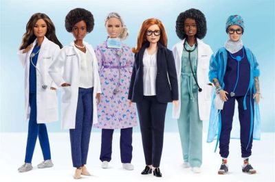 Nell’immagine in alto, la scienziata Sarah Gilbert (coinventrice della formula del vaccino contro Covid-19 prodotto da AstraZeneca) con tailleur nero e capelli rossi, in versione Barbie insieme ad altre bambole ispirate alle donne attive nel campo sanitario.