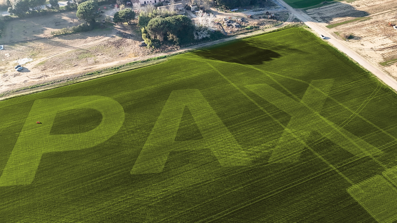 Nella campagna di San Piero a Grado, alle porte di Pisa, un’area di circa tre ettari di tappeto erboso è stata trasformata in una grande tavolozza naturale per la realizzazione di una scritta a forte valore simbolico. La parola latina PAX, estesa per circa 180 metri e visibile anche dagli aeromobili in fase di atterraggio presso l’aeroporto “Galileo Galilei”, campeggia nel paesaggio agrario come messaggio universale di pace, equilibrio e armonia.